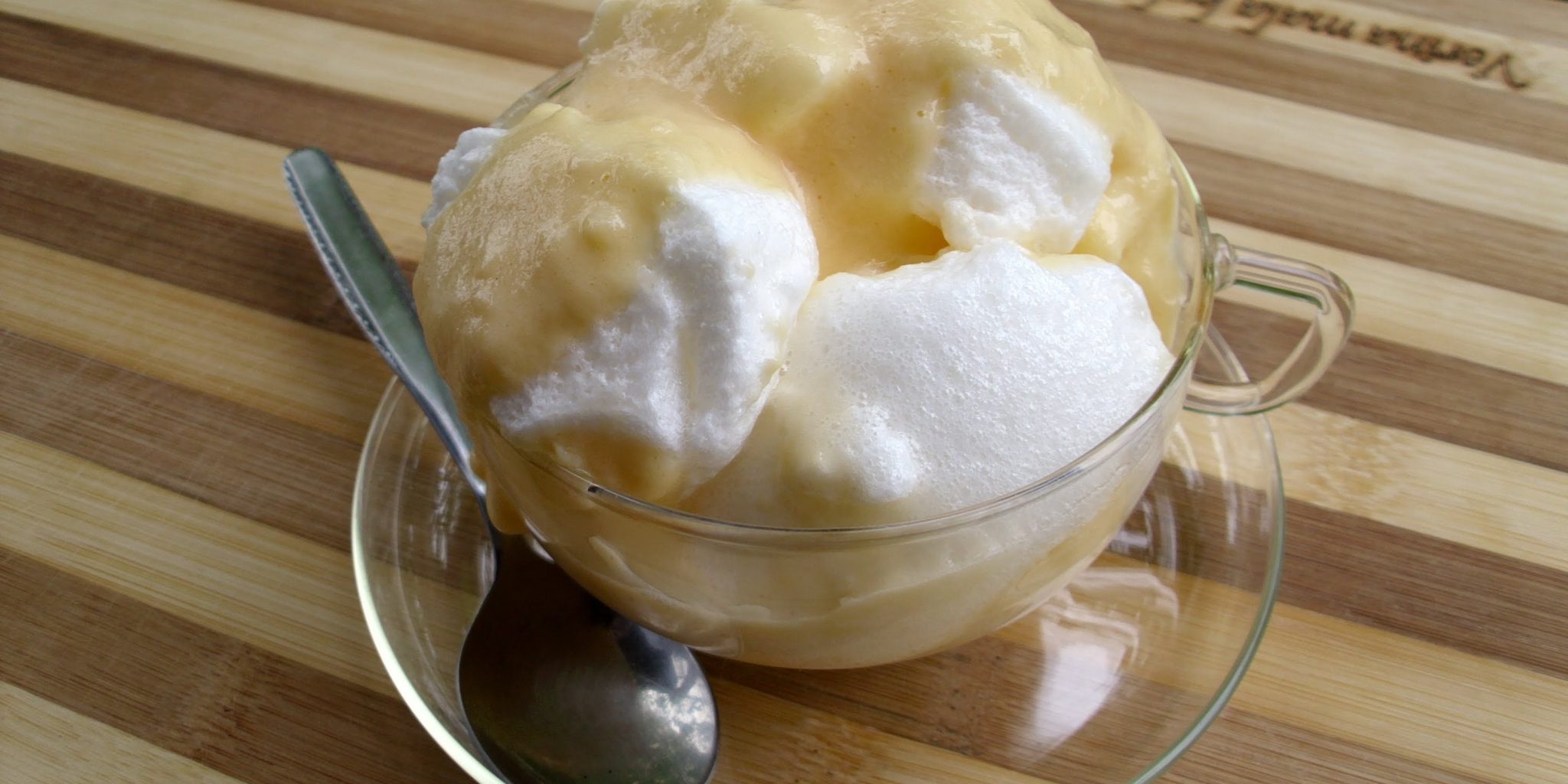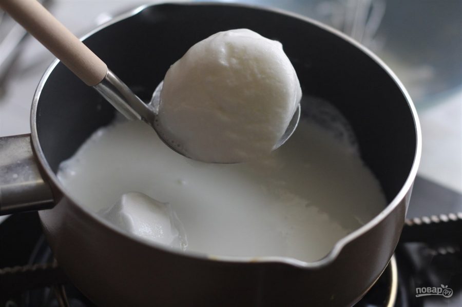 Как только молоко закипело убавляем его и ждём когда оно перестанет подниматься. В это время берем взбитые белки и начинаем выкладывать их по столовой ложке в кипящее молоко. Опускаем аккуратно пока не заполнится поверхность первой порцией таких снежных пен. Каждый из комочков перевернуть и поварить в течении нескольких минут. Затем в подготовленную заранее глубокую миску их выкладываем. Как только все белковые комочки сварены, в молоко тонкой струйкой вливаем желтковую массу. Добавляем сахар и при постоянном помешивании варим несколько минут. Затем процеживаем эту массу через сито или марлю. Добавляем эту массу в снежки и ставим остужаться в холодильник на несколько часов.