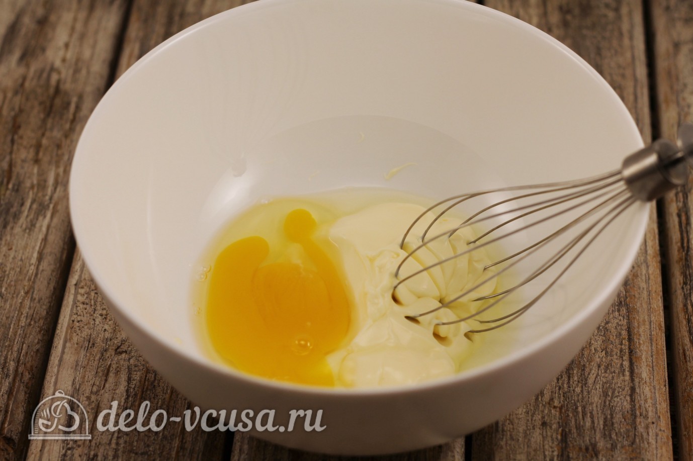 Перемешать венчиком яйца с майонезом, пока у вас не получится желтоватая жидкая масса.