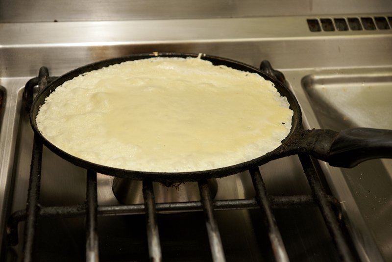 Прогрейте сковороду и смажьте ее в первый раз маслом. Затем перемешайте тесто и вылейте половину половника на сковороду, быстро очертите им в воздухе круг, чтобы тесто образовало круг на дне сковороды. Обжарьте блин с одной стороны примерно 1 минуту.
