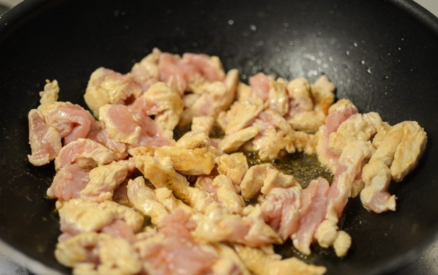 Мясо промыть, обсушить и нарезать ломтиками, толщина которых должна составлять около 1 см, а затем ломтики нарезать поперек волокон полосками.