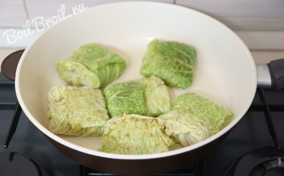 На дно кастрюли налить воды 1-1,5 см, выложить обжаренные голубцы, масло после обжарки голубцов и все залить подготовленным соусом. Довести до кипения, а затем до готовности на слабом огне в течение 25-30 минут.