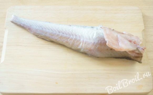Рыбу разморозить, промыть под водой, выпотрошить, убрать плавники, хвост и внутреннюю черную пленку.