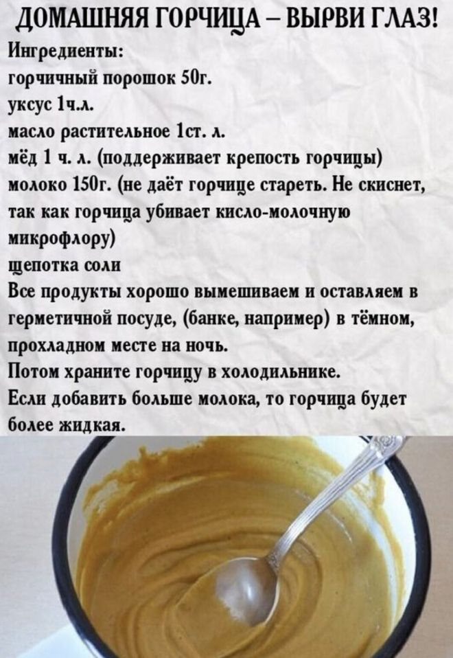 - Самое главное в домашней горчице — дать ей постоять два дня перед использованием. Это позволит горькому вкусу горчицы рассеяться.