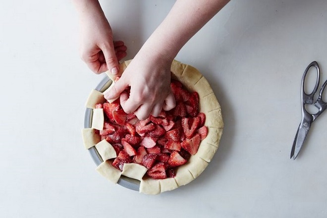 Не знаете, как украсить пирог тестом более экстравагантно? Вооружитесь ножницами и надрежьте ими свободные края теста на равном расстоянии. Готовые кусочки сверните через один, чтобы получить очень интересный зубчатый край.