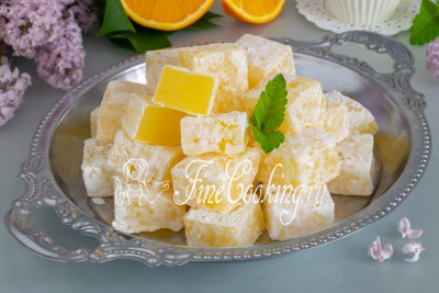 Рахат-лукум по указанному ниже рецепту готовится проще, чем по предыдущему, но состав продуктов тут более широкий. Однако это благотворно влияет на вкус. Легкая кислинка цитрусовых фруктов в сочетании с сахаром делает его очень интересным и освежающим.