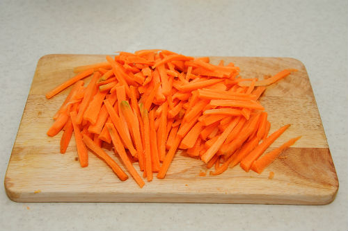 - А с морковкой нужно придерживаться канонов, только соломкой (тонкими длинными палочками).
