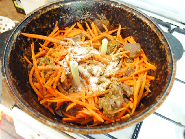 Порезанные, но не слишком мелко, морковь и лук добавляем к мясу. Солим, перчим, добавляем приправы и перемешиваем. Уменьшаем огонь и продолжаем жарить примерно 10 минут. В итоге у вас получится зирвак.