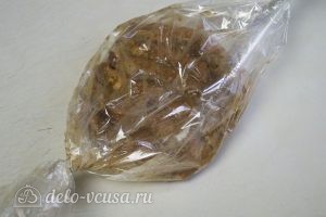 - Плотно стягиваем рукав, а духовку ставим прогреваться до 180 градусов. Когда она достаточно нагрелась, убираем внутрь форму с пакетом. Ждем полтора часа, а затем вынимаем пакет из печи.