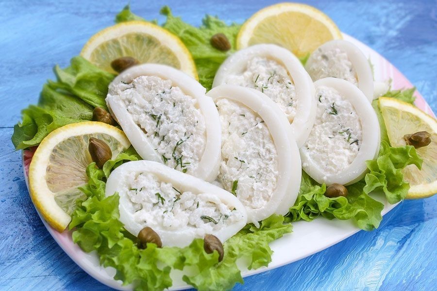 - Заливают смесью нарезку кальмаров.