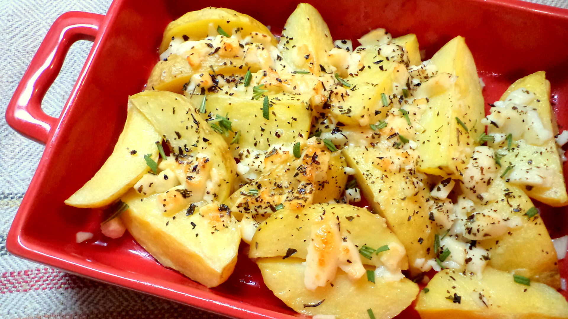 Сделать внешний вид блюда еще более нарядным, а вкус – ярким, поможет твердый сыр. Измельчите продукт с помощью крупной терки. Посыпав картофель специями и чесноком, слегка полейте его майонезом или сметаной, после чего притрусите сырной стружкой.