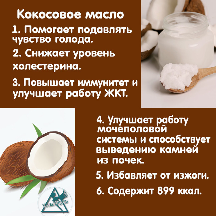 - — Способствует похудению, стимулирует работу мозга и повышает уровень полезного холестерина благодаря все той же лауриновой кислоте.