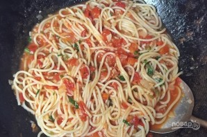 Макароны отвариваем до готовности, бросив по желанию в воду раскрошенный бульонный кубик. Затем отбрасываем их на дуршлаг, а потом перекладываем в томатный соус и размешиваем ложкой.