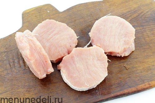 - Свиную вырезку промойте, обсушите бумажным полотенцем и порежьте на ломтики толщиной около 1,5 см.