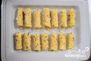 3. Взять одну палочку сыра Моцарелла, обвалять в муке, затем окунуть в смесь яиц и молока, поле чего обвалять в смеси панировочных сухарей и петрушки. Повторить с оставшимися палочками.