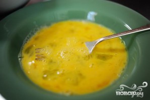 - В миске взбить яйца, молоко. Добавить к ним соль и перец. Вымочить в смеси приготовленный сыр.