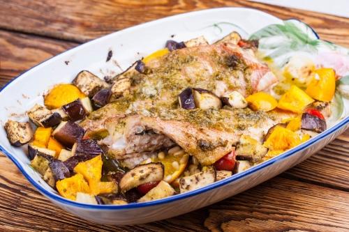 6. Запекать рыбу с овощами около 25 минут при 180 градусах. Если рыба не готова, увеличить время приготовления еще на 5-10 минут.