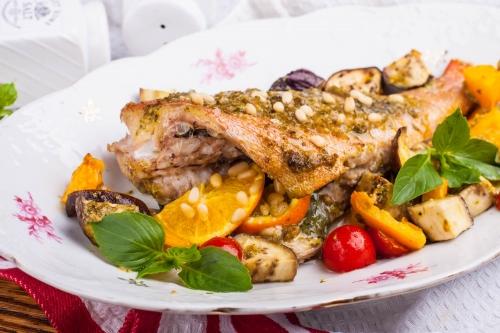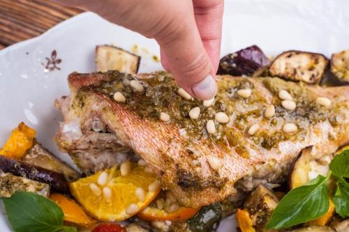 7. Перед подачей украсить рыбу листиками базилика и оставшимися кедровыми орешками.