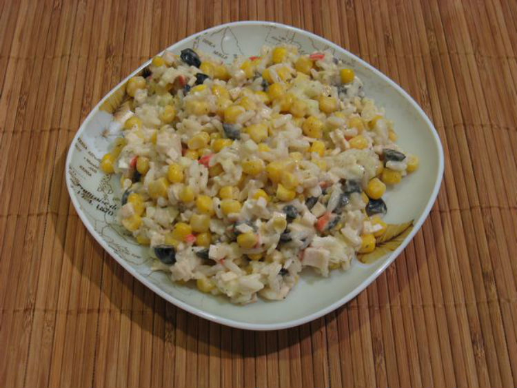 Это стандартный рецепт салата. Некоторые в него добавляют еще свежий огурец, сыр или отваренный рис. Также крабовые палочки можно заменить крабовым мясом. Получается не менее вкусно.