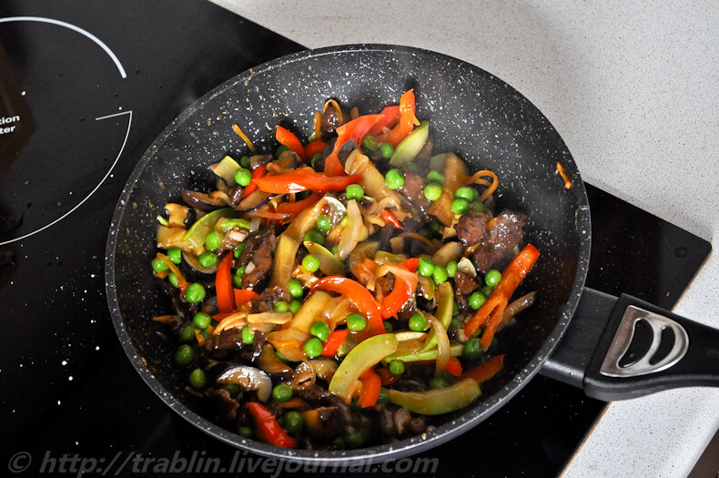 ΠΠ°Π»Π΅Π΅ Π΄ΠΎΠ±Π°Π²Π»ΡΠ΅ΠΌ Π·Π΅Π»Π΅Π½ΡΠΉ Π³ΠΎΡΠΎΡΠ΅ΠΊ ΠΈ ΡΠ΅ΡΠ½ΠΎΠΊ, ΠΎΠ±ΠΆΠ°ΡΠΈΠ²Π°Π΅ΠΌ Π²ΡΠ΅ ΠΏΠ°ΡΡ ΠΌΠΈΠ½ΡΡ.