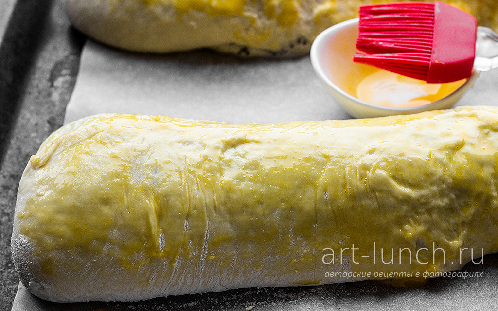 Перекладываем рулеты на противень, застеленный бумагой для выпечки, накрываем полотенцем и оставляем на 10-15 минут. После чего смазываем каждый при помощи силиконовой кисточки взбитым желтком. Это даст приятный румянец при выпечки, без смазывания рулеты будут бледными. Вместо желтка можно использовать молоко, тоже даёт хороший колор. Отправляем в разогретую до 180°С духовку на 45-50 минут.