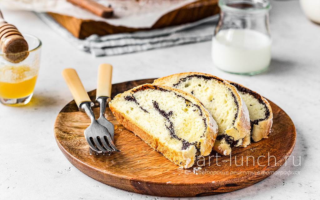 По желанию можно увеличить количество начинки, и тогда десерт приобретет ярко выраженный маковый вкус. Сдобная выпечка идеально подходит к чаю, но её можно подать также с фруктовым соком, кофе, молоком или какао. Особенно вкусно, если нарезать его ломтиками и намазать сверху сливочным маслом, получается как пирожное.