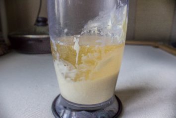 Если пробили без пузырьков, отлично, сразу накрываем глазурь пищевой плёнкой в контакт, так как глюкозный сироп образует плёночку на глазури. Если противные пузырьки образовались, нужно процедить глазурь в другой кувшин через мелкое сито и накрыть плёнкой. Всё, ставим в холодильник на 12 часов или на ночь, чтобы глазурь созрела.