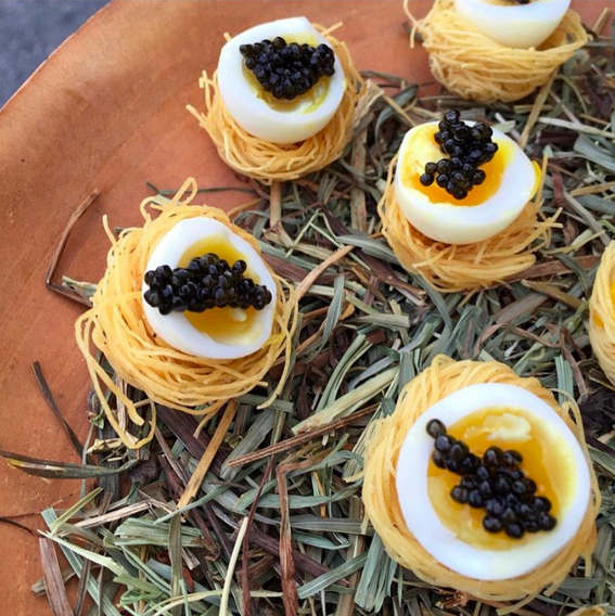 Гнезда состоят из тертого картофеля, который выкладывается на противень для кексов, после чего в каждое гнездо вбивается перепелиное яйцо.