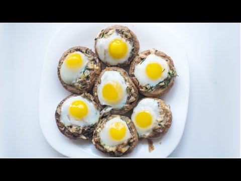 Все, что вам нужно сделать, это удалить ножку грибов, чтобы освободить место для начинки, затем разбить в полость перепелиные яйца и посыпать сыром и зеленым луком.