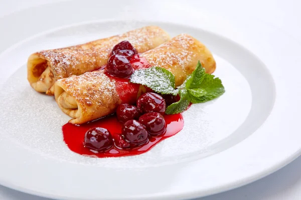 Наконец-то пришло время сервировки! Положите желаемое количество блинчиков на тарелку и полейте сверху вишневым соусом. Тогда наслаждайтесь!