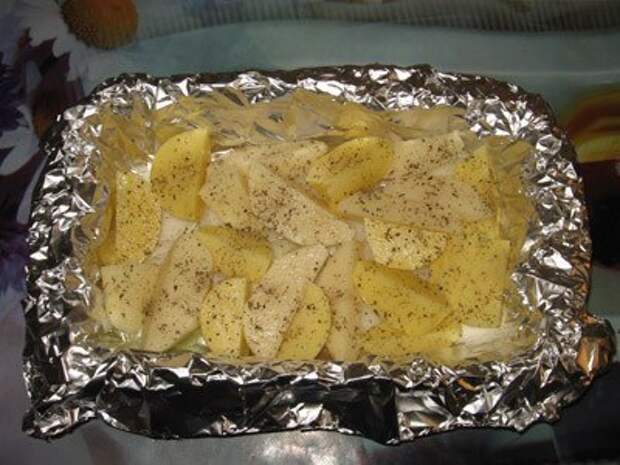 2. Фольгу нарезать прямоугольниками. На каждый кусок фольги выложить ровным слоем ломтики картошки. Приправить их пряностями и солью.