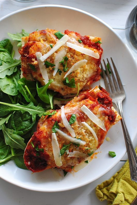 Просто разотрите половинки куриных грудок без костей и посыпьте каждую прошутто и сыром моцарелла. Свернуть кусочки курицы, обвалять в панировочных сухарях и запечь.