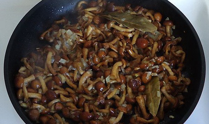 4. Опята обжарить на масле. Они не должны быть слишком сухими, но хорошо обжаренными до золотистого оттенка – тогда их аромат станет еще насыщенней. В конце обжаривания их нужно слегка подсолить.