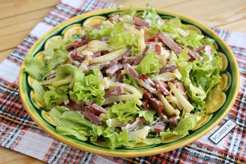 Салат «Любимый» получил свое название за то, что его любят все, и он всегда первым исчезает со стола. Этот салат достаточно питательный, так как в него входит колбаса и яичные блинчики, но в тоже время он имеет легкий свежий вкус. Рецепт салата очень простой, для его приготовления потребуется не больше 20 минут.