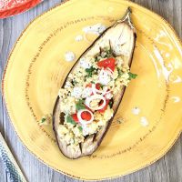 Наполните полые баклажанные шкурки пшенкой, посыпьте фетой и верните на мангал, чтобы блюдо прогрелось. Баклажаны на мангале подают с соусом из йогурта со специями, в сопровождении свежего салата.