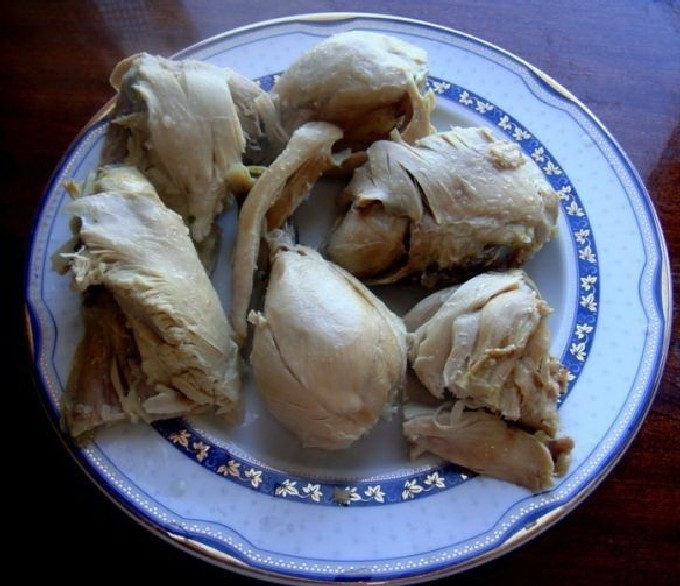 - Проверьте, готово ли мясо. Готовые кусочки выложите на отдельную тарелку для остывания. Кожу и кости удалите и выбросите. Разделите мясо на крупные куски.