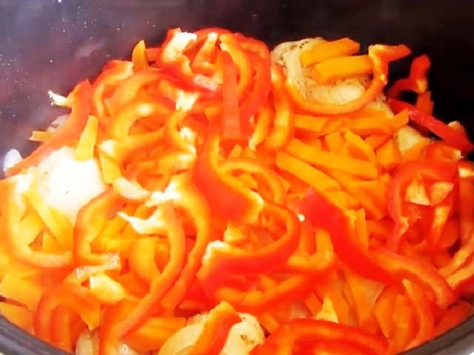 - Закладка ингредиентов производится по следующей схеме: сначала кладется мясо, затем лук, перец, помидоры.