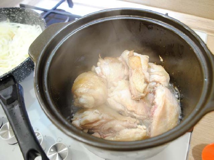 - Куски курицы в коже промойте и сложите в кастрюлю, налейте холодную воду и поставьте на плиту вариться. Периодами убирайте пенку.