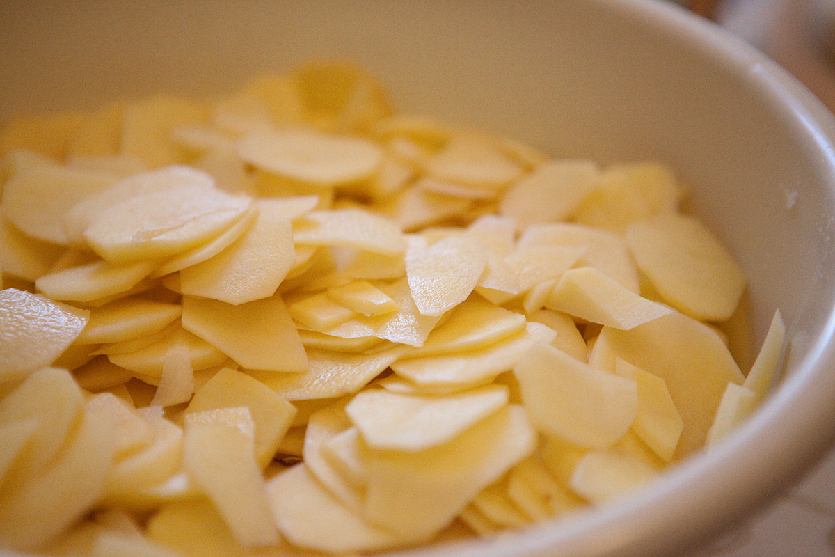Пока тесто поднимается, подготавливаем начинку. Жирную баранину мелко режем. Картофель тоже режем очень тонко (я это сделала при помощи терки бернера). Репчатый лук режем полукольцами.