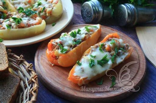 Готовой начинкой нафаршировать половинки сладкого перца. Выложить перец на противень, застеленный пергаментом или фольгой (если, есть подходящая форма для запекания, то можно и в ней готовить) и отправить в заранее разогретую духовку до 180 градусов, на 15-20 минут.