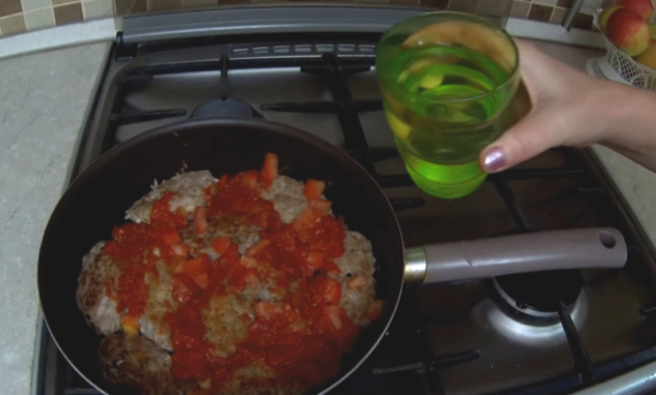 - Когда фарш и овощи немного поджарятся, наливаем нужное количество томатного сока.
