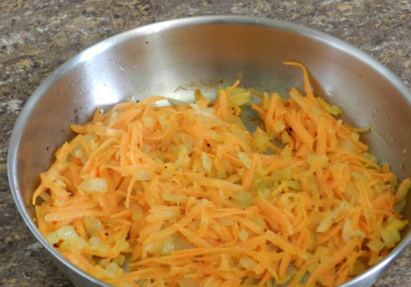 - Обжарьте пару минут на сковороде морковь и лук, которые нужно мелко нарезать.
