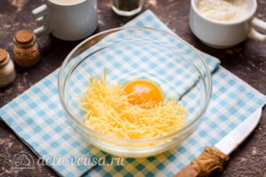 Твердый сыр натереть на мелкой терке и переложить в глубокую миску, туда же добавить несколько ложек воды и вбить куриное яйцо.