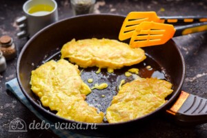 - Жарим, не убавляя огонь, до образования золотистой корочки, и переворачиваем на другую сторону. Учитываем, что кляр вбирает в себя масло, поэтому, при необходимости, его понемногу подливаем.