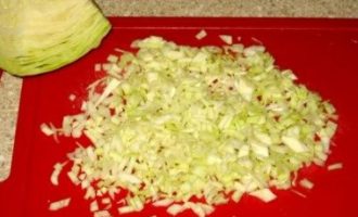 - Лук нарежьте кубиками, капусту – тонкими полосками или тоже кубиками.
