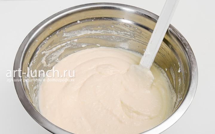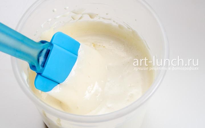 Сначала, так же, делаем это кулинарной лопаткой, а потом венчиком на низкой скорости — до гладкого и однородного состояния.