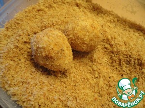 Сверху выкладываем перепелиные яйца в сырной панировке. Непосредственно перед подачей поливаем заправкой.