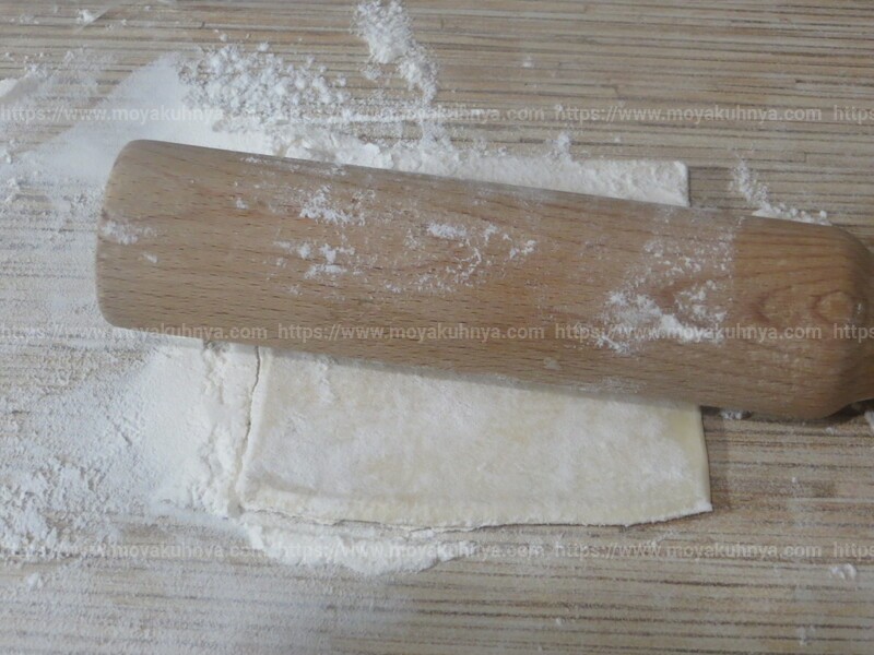 - Тесто снова раскатать в пласт и порезать его на прямоугольники;