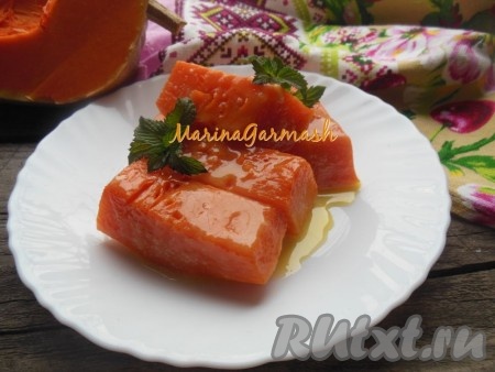 - Тыкву нарезают крупными кубиками или брусочками, смешивают в посудине с приправленной по вкусу сметаной.