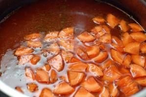 Вот теперь можно добавить специи. Я указала в составе те, которые обычно используются для харчо. Но вы можете использовать хмели-сунели, ведь в этой приправе есть практически все необходимое.