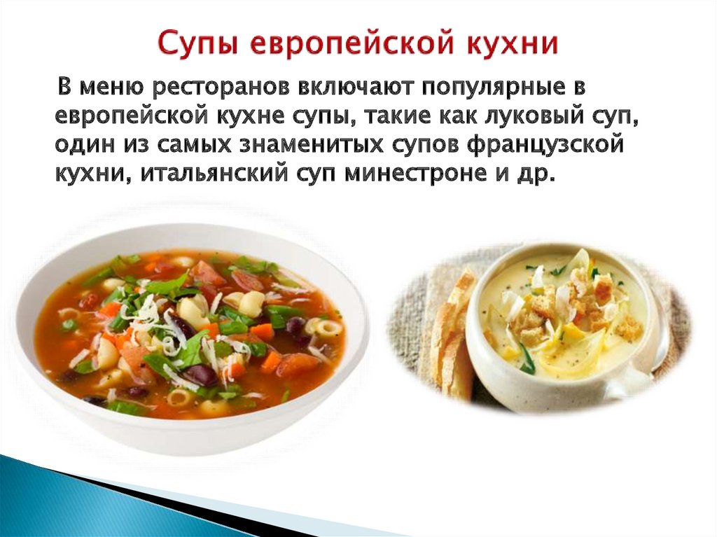 Однако именно хороший бульон придает супу твердость и силу. После закуски суп — это первое блюдо в прямом смысле слова. При его приготовлении важно проявлять особую осторожность, так как он произведет первое впечатление на гостя. У супов есть много форм — некоторые супы жидкие и подаются как бульоны, а некоторые подаются как прозрачные супы, такие как консоме.